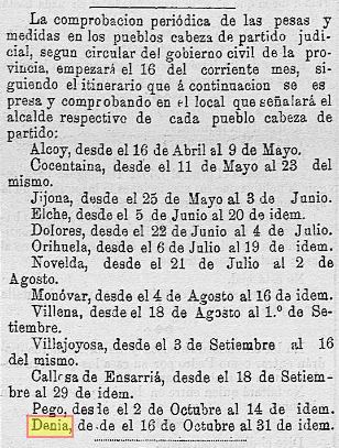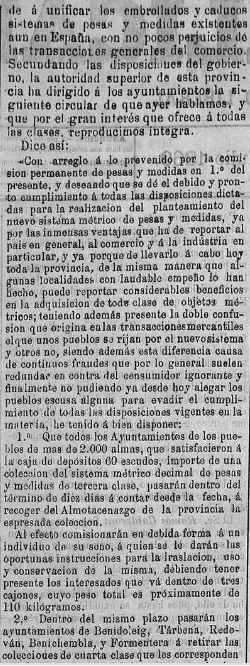 Més tard, per a assegurar el seu compliment, periòdicament es comprovava, in situ, que els jocs de pesos i mesures en cada poble, es mantenien inalterats, tal com demostra aquesta publicació d’abril de 1886: