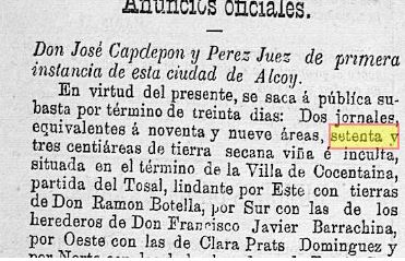 A les mesures de superfície hauríem d’afegir el jornal, equivalent a 4.358,3025 m2. “El jornal es defineix com l’extensió de terra que es podia treballar en un dia. La seva extensió depèn del tipus d’agent treballador (persona, mul, parella de bous, cavall, etc.), del tipus de lloc (camp, de blat, prat, vinya) i de la classe d’activitat a realitzar-hi (llaurar, sembrar, segar, dallar herba, veremar, plantar ceps…).” (ttps://ca.wikipedia.org/wiki/Jornal)