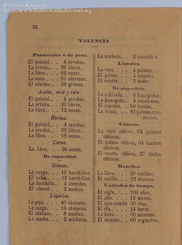 Tabla de equivalencias de pesas y medidas de Valencia