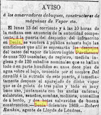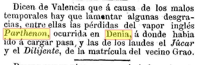 La primera setmana de novembre de 1869, a causa del fort temporal de mar que regnava en les nostres costes, naufragava el vapor anglés Parthenon quan es dirigia a Dénia a carregar pansa.