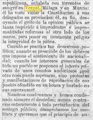L’esment als “torrents de sang al Verger, Màlaga i Múrcia” fa al·lusió als “Cantons” formats a Màlaga i Cartagena. Però cap esdeveniment sagnant associem al Verger, si bé, la partida carlista del capitost Fuster, caminava per aquelles dates per la nostra comarca, en concret pel poble d’Alcalalí. De esta partida formava part el benidormer Joaquim Josep Thous Orts, pare de Maximilià Thous Orts, l’autor de l’Himne de la Comunitat Valenciana.