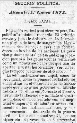 La crònica està situada al final del regnat d’Amadeu I de Savoia i a un mes de la instauració de la Primera República. Una època de grans convulsions a nivell polític i social on, a més, l’ambient revolucionari coexistia amb la Guerra dels Deu anys de Cuba i la Tercera Guerra Carlista. En la nostra zona l’ambient era bèl·lic: el Capità General de València participava que concediria l’indult a tots els carlistes que s’entregaren amb les seues armes; i el Ministre de la Guerra havia donat ordre perquè totes les armes que hi havia al Castell de Santa Bàrbara d’Alacant, es posaren a la disposició del Governador Civil perquè es repartiren entre els voluntaris de la República dels pobles de la província d’Alacant.
