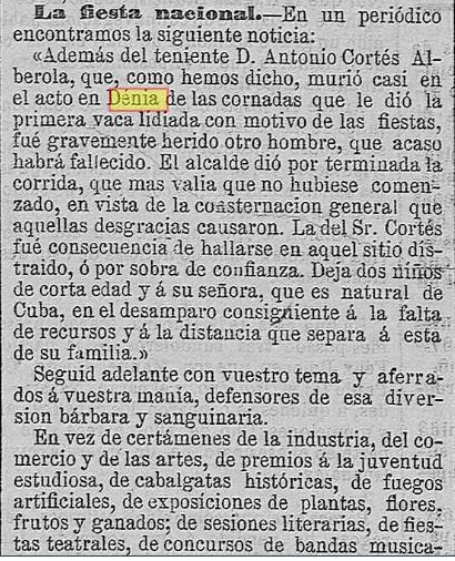 També, pel juliol, una vaca de corda, va matar a un tinent del Batalló de Diposit de Dénia, a les festes de Dénia. Per aquestes dates la festa dels bous ja tenia molts detractors com indica aquesta retallada de periòdic: