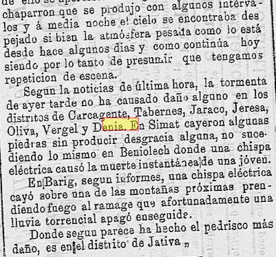 En aquest mateix mes, una tempesta elèctrica, que no va causar pèrdues en la nostra agricultura, va soltar una espurna elèctrica a Benidoleig, causant la mort instantània d’una jove.