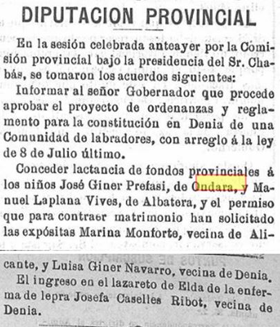 Per desembre de 1898 la Diputació destinava fons provincials per pagar la lactància del xiquet d’Ondara José Giber Prefasi i autoritzava les sol·licituds per a contraure matrimoni de diverses dones expòsites al seu càrrec, una d’elles de Dénia.