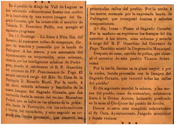 A Laguar celebraven aquest mes les festes patronals dedicades a la Verge del Rosari i al Sagrat Cor, amb carreres (o “corridas”) de pollastres, misses solemnes, danses i processons acompanyades per la banda de música de Pedreguer.