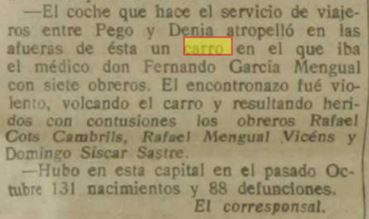 Per aquesta mateixes dates la diligència que feia el trajecte regular entre Pego i Dénia xocava amb un carro que portava set obrers, resultant diversos ferits (era el 2on accident en aquest any prop de Pego)