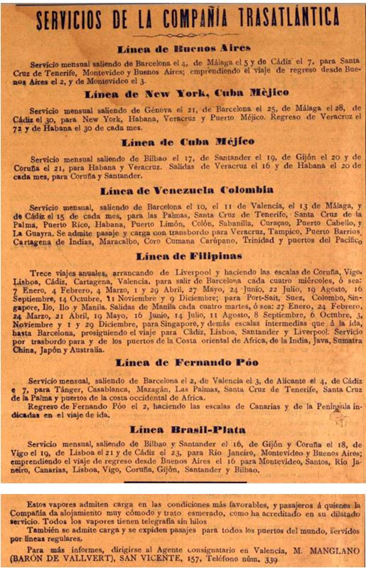 Les panses i les taronges pels sòls, els aliments pels núvols… només quedava l’emigració. Era l’última eixida. I com ocorre sempre en aquesta vida, algú treia profit de tanta penúria i les grans companyies navilieres van formar trusts que permetien el control absolut i per tant l’abús en els viatges migratoris dels nostres famolencs avantpassats. El preu del passatge podia representar entre 100 i 200 jornades de treball (200 a 300 ptes costava el passatge) i les mal anomenades “migracions gratuïtes”, finançades per l’Argentina, Xile o el Brasil “incentivades per agents reclutadors sense escrúpols” no facilitaven molt la cosa. En els vaixells hi havia quatre classes d’allotjaments. L’última era la classe “emigrant”, no disposava de cap comoditat, els passatgers es distribuïen en centenars de lliteres disposades en els cellers, “foscor, pudor, humitat i un soroll infernal… l’alternativa era un viatge a la intempèrie, opció preferida per no pocs viatgers”.
