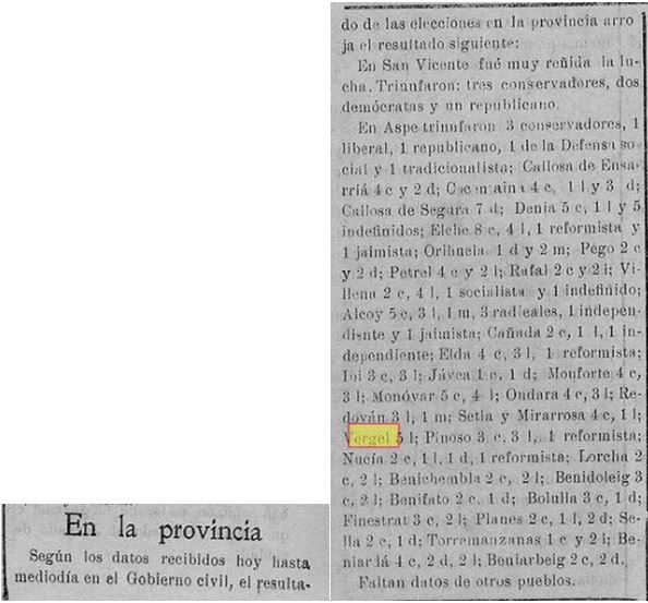 I a mitjan novembre es duien a terme eleccions que donaven al Verger 5 liberals, 2 conservadors i 2 demòcrates a Beniarbeig, a Setla Mirarrosa 4 conservadors i 1 liberal, 4 conservadors i 3 liberals a Ondara i 5 conservadors, 1 liberal i 5 “indefinits” (sic) a Dénia.
