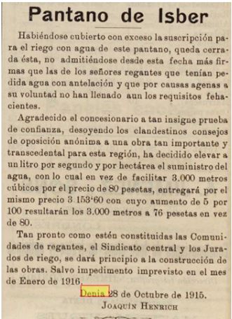 El dia 28 Joaquín Henrich, responsable del projecte del Pantà de Isbert, anunciava que es tancava les subscripció de terres en haver-se cobert amb escreix el càlcul inicial. Al mateix temps elevava 1 litre per segon i per hectàrea el subministrament de l’aigua.