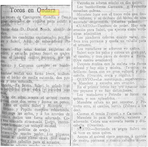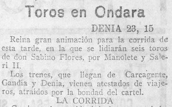 A Ondara se celebrava a la fi de novembre, aprofitant la seua Fira, una correguda de bous presidida per l´alcalde Daniel Bosch, en la qual van torejar les quadrilles de Saleri i Manolete.