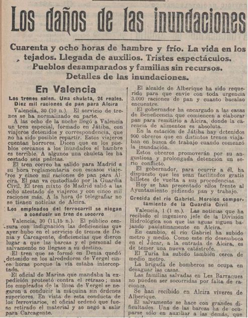 Les notícies que anaven arribant eren alarmants i viatgers que podien eixir de les zones afectades “comptaven horrors”, com que als “pobles inundats la fam era terrible” i que els aliments escassejaven tant que a alguns “una xulla els havia costat sis pessetes”.