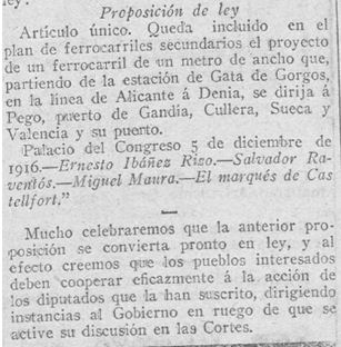 I el que al juny semblava un rumor amb poques expectatives de portar-se a la pràctica (veure 2 trimestre) començava a prendre cos: en el Congrés dels Diputats es reunien els representants a Corts per Gandia, Sueca, Dénia i Pego i acordaven presentar una Proposició de Llei perquè fóra inclòs en el Pla de Ferrocarrils Secundaris una línia que partint de Gata i passant per Pego enllaçara a Gandia amb la línia que porta al Port de València. En concret, la línia passaria per Pedreguer i els pobles de la Rectoría (Beniarbeig, Sanet, Negrals i Benimeli), Pego, Port de Gandia, Cullera i Sueca, acabant en el Port de València.