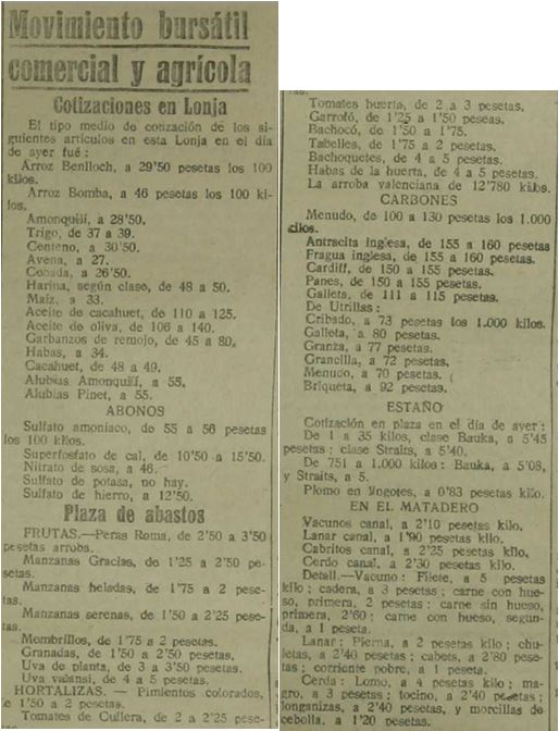 I els jornals pels sòls, i a més, molt escassos: (entre 0,75 ptes els aprenents i 2-2,50 ptes els veterans). I els aliments pels núvols: el Kg de filet de vedella a 5 ptes, la pata del corder a 2 ptes i les xulles a 2,40 ptes/Kg.; el llom de porc a 4 ptes, i el magre a 3 ptes. I el pà a 50 o 55 cèntims.