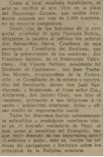 El diumenge 17 d’agost, a les deu i mitja de la nit” (fixeu-vos en l’hora) va tindre lloc a Pego un míting de propaganda catòlic-social al qual van assistir representants del Consell Directiu de la Confederació de Sindicats.