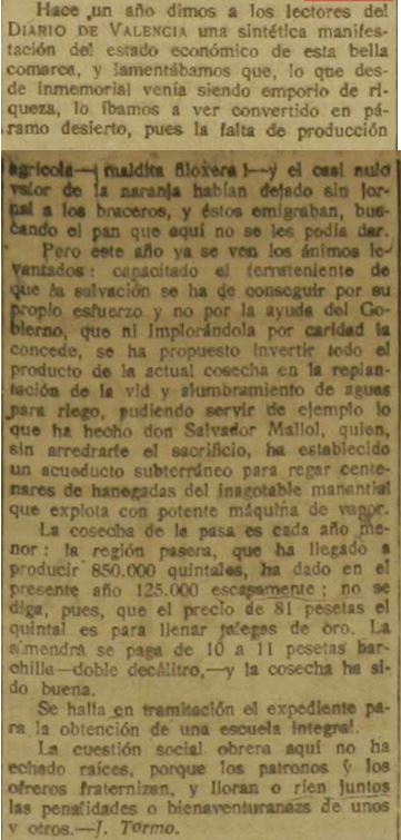 No obstant això “enguany ja es veuen els ànims alçats” perquè les vinyes s’estaven replantant i s’estaven “alumbrando” aigües per a reg que treien dels pous potents màquines de vapor. Es referia a les transformacions que estava duent a terme Salvador Mallol, qui, a més, “ha establit un aqüeducte subterrani per a regar centenars de fanegades”.