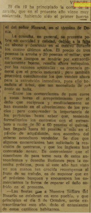 En un segon article publicava que el dia 19 de setembre començava la recol·lecció de la taronja en un dels horts del “senyor Morand”, en el Terme de Dénia, advertint que la collita es presentava dolenta a causa de la “falta d’adobs i del descuit” dels últims quatre anys (els anys de la Guerra Mundial).